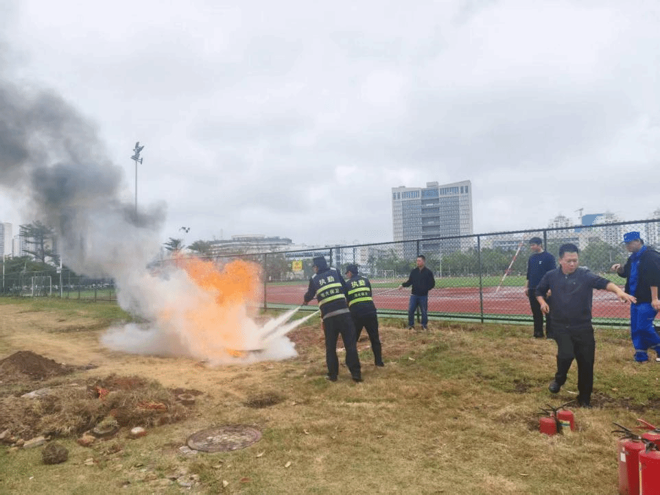 随后,安全科科长任贤操带领参训人员在校园体育馆北侧有序开展实操演练。参训人员分组进行灭火器实操训练,反复熟悉流程、纠正动作,在工作人员的现场指导下,逐步掌握了灭火器材的使用。