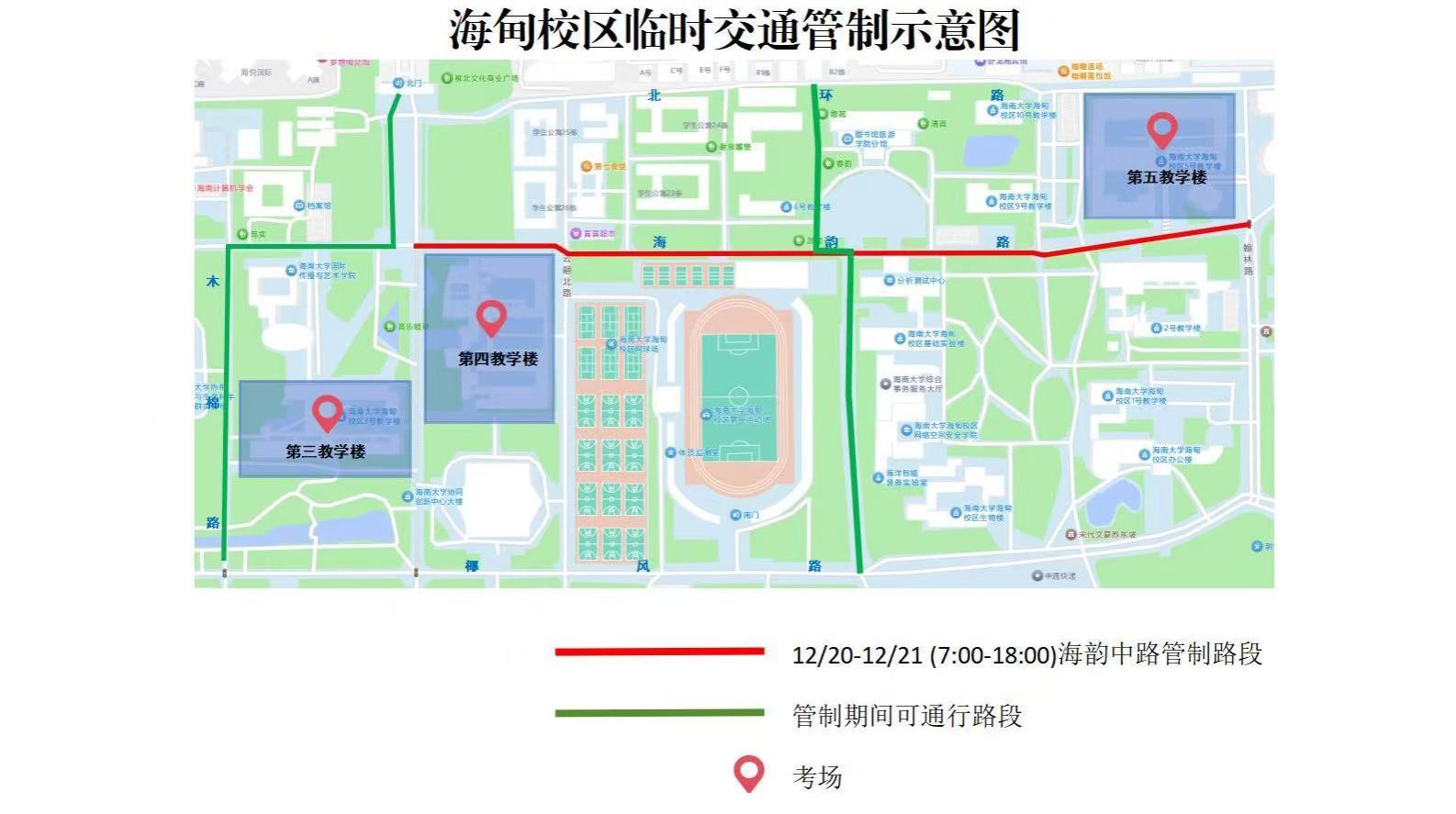 3.12月20日至21日(7:00-18:00)海韵中路(协同创新大楼至社科楼红绿灯路段)实施临时管制,禁止车辆通行。行经此路段的车辆及人员需绕行。东西向可选择北环线绕行,南北可行至椰风路段绕行。(详见附图)