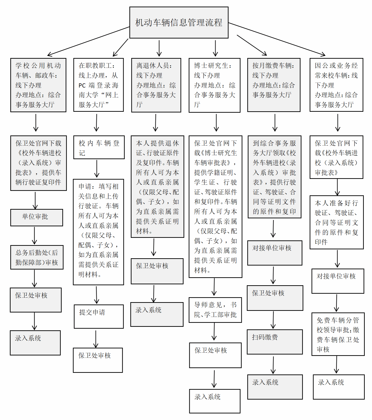 4.博士研究生车辆:线下办理,博士研究生本人提出申请,填写《博士研究生车辆审批表》,提供学籍证明、学生证、行驶证、驾驶证原件及复印件。每人仅限在车辆管理系统中免费登记一辆,车辆所有人可为本人或直系亲属(仅限父母、配偶、子女),如为直系亲属需提供关系证明材料,经导师、所在书院、学生工作部(人民武装部)审批同意,负责人签字盖章后,报保卫处审核,到海南大学综合事务服务大厅4号窗口线下办理。