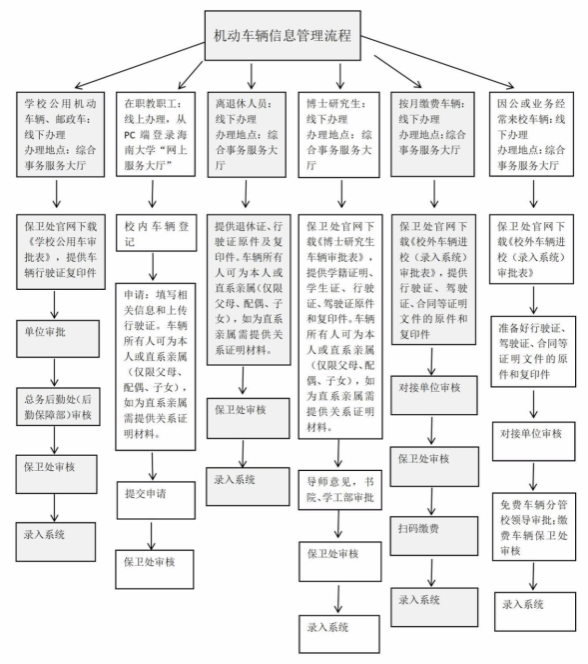 4.博士研究生车辆:线下办理,博士研究生本人提出申请,填写《博士研究生车辆审批表》,提供学籍证明、学生证、行驶证、驾驶证原件及复印件。每人仅限在车辆管理系统中免费登记一辆,车辆所有人可为本人或直系亲属(仅限父母、配偶、子女),如为直系亲属需提供关系证明材料,经导师、所在书院、学生工作部(人民武装部)审批同意,负责人签字盖章后,报保卫处审核,到海南大学综合事务服务大厅4号窗口线下办理。