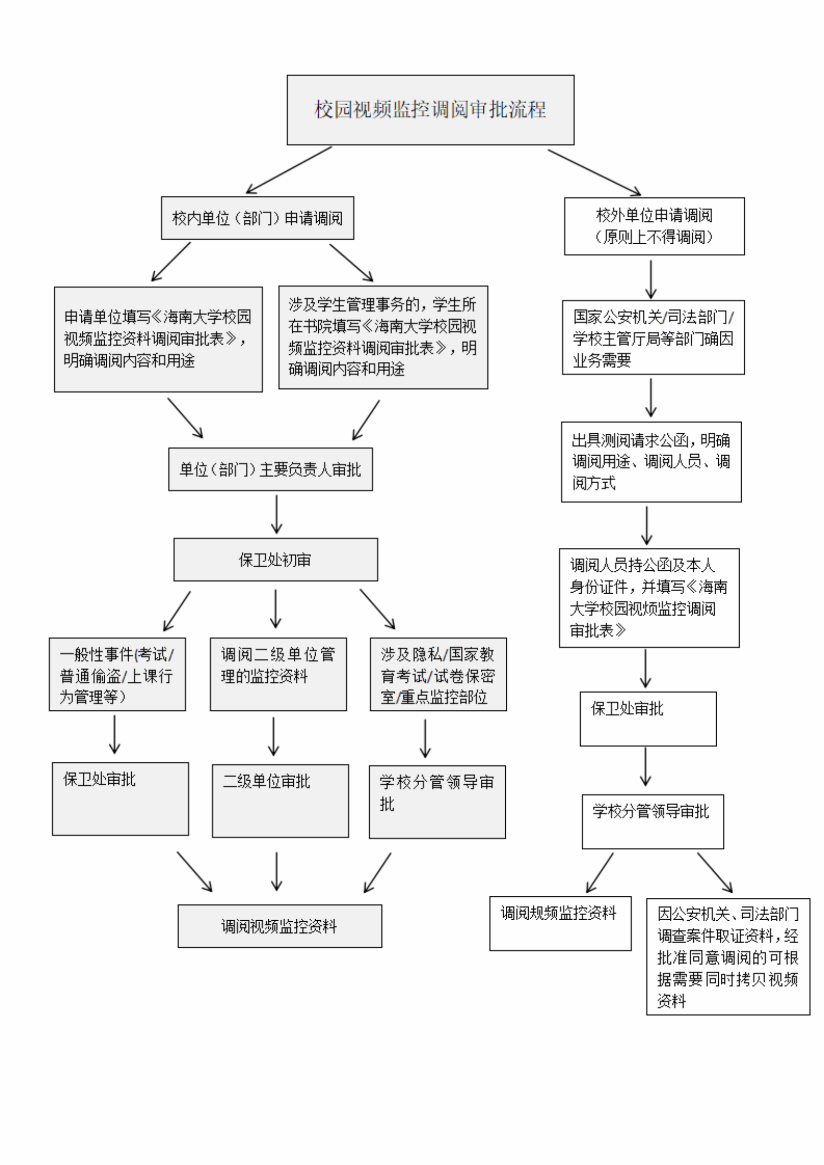 1.调阅单位填写《海南大学校园视频监控资料调阅审表》明确调阅内容和用途,经单位(部门)主要负责人签字并加盖部门公章报保卫处。涉及学生管理事务需调阅视频监控资料的,由学生所在书院向保卫处提出申请。